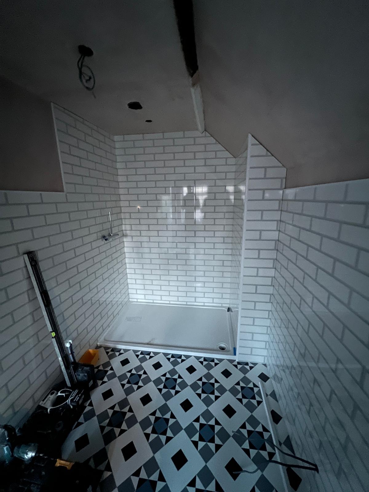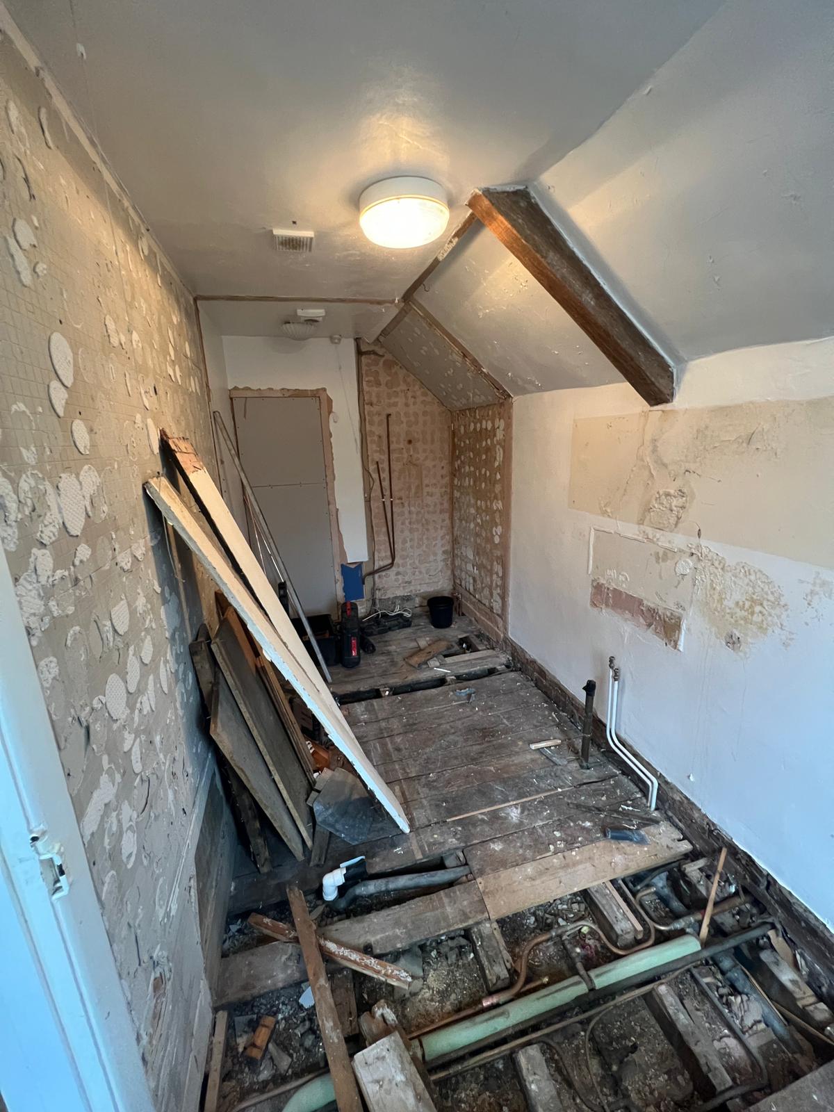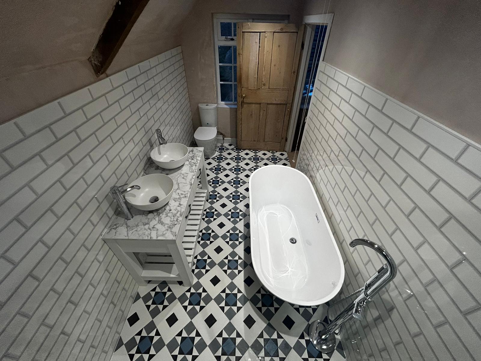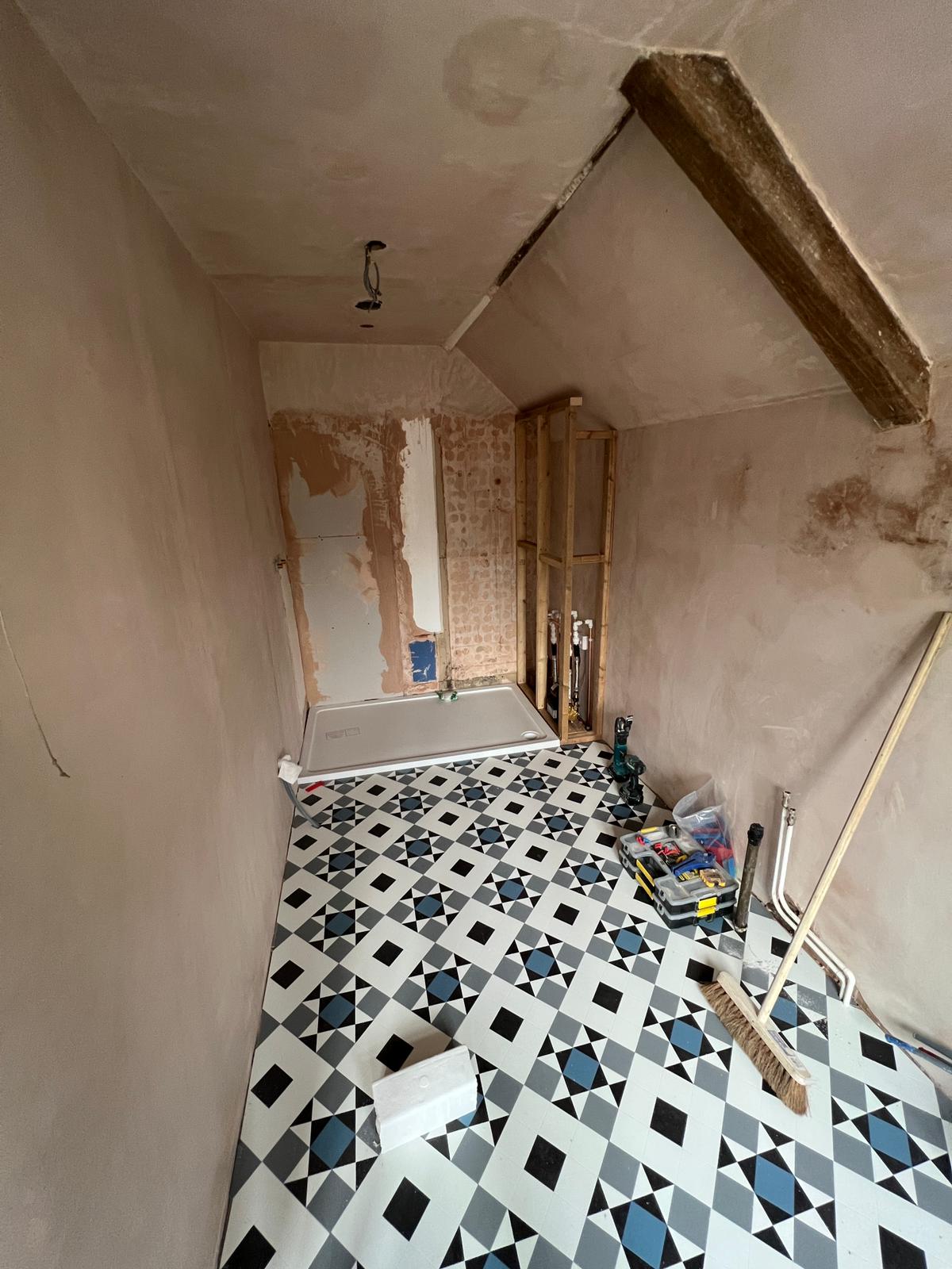 This transformation involved ripping out the existing floor, levelling the timber floor joists and laid 22mm moisture resistant flooring. Re plaster boarded and plastered throughout. Updated electrics, installed downlights, shaver points, extraction fan and electric heater. We installed a new water pump for better water pressure, a shower and enclosure, a modern bath, his and hers sinks and a toilet. All the walls are tile effect aqua panels. We fitted new skirting and architrave then finally squared up and refitted the hundred year old door.