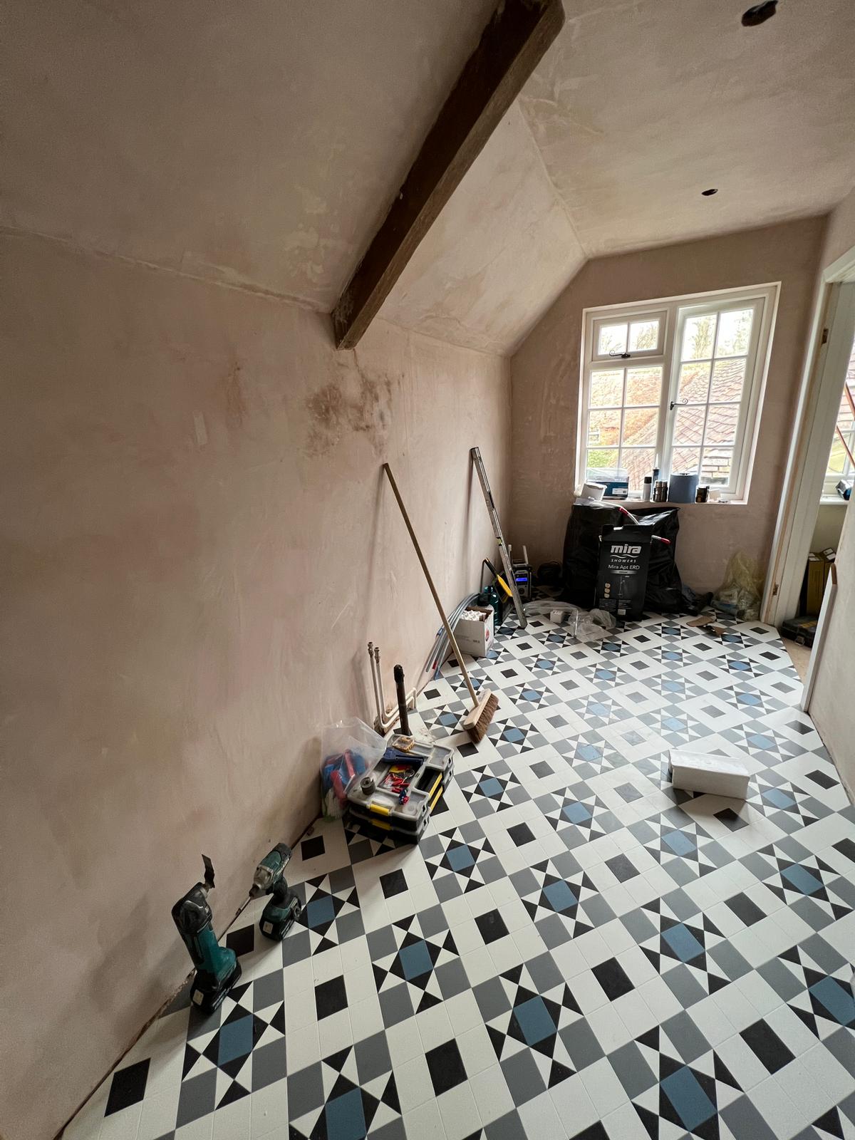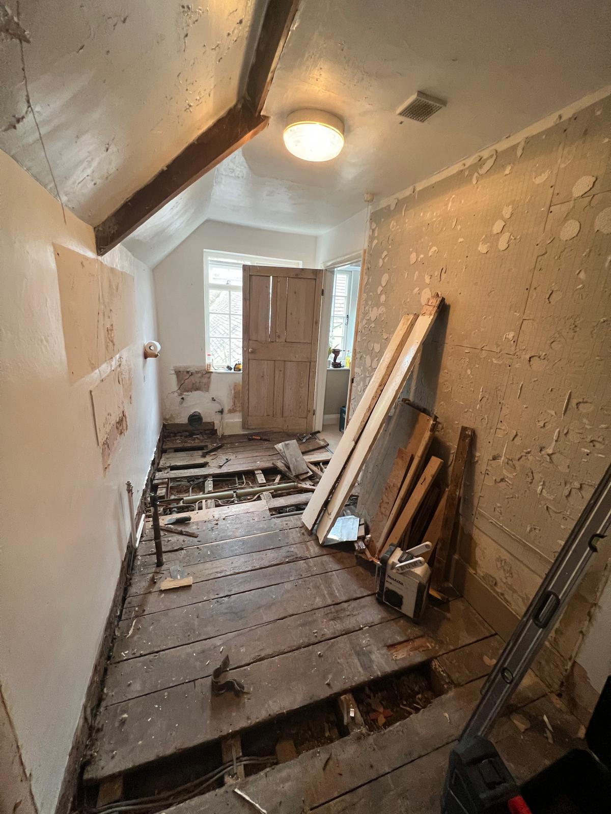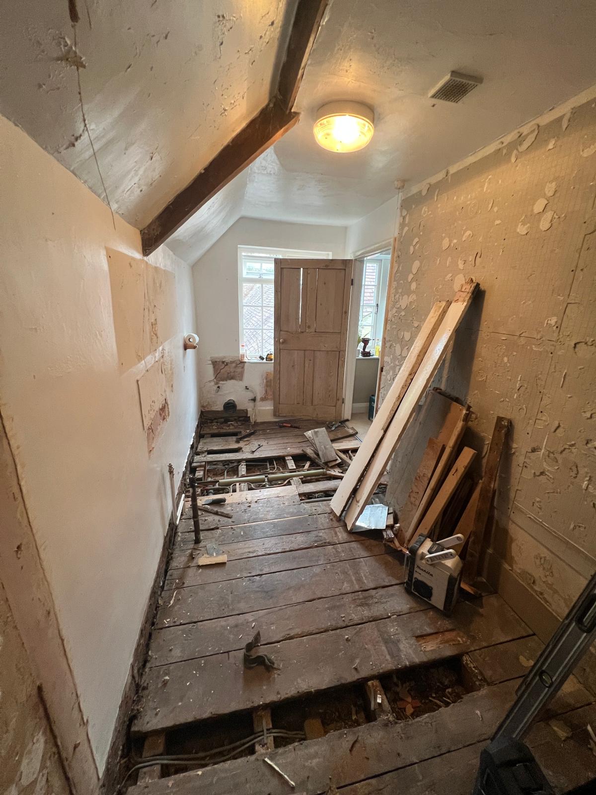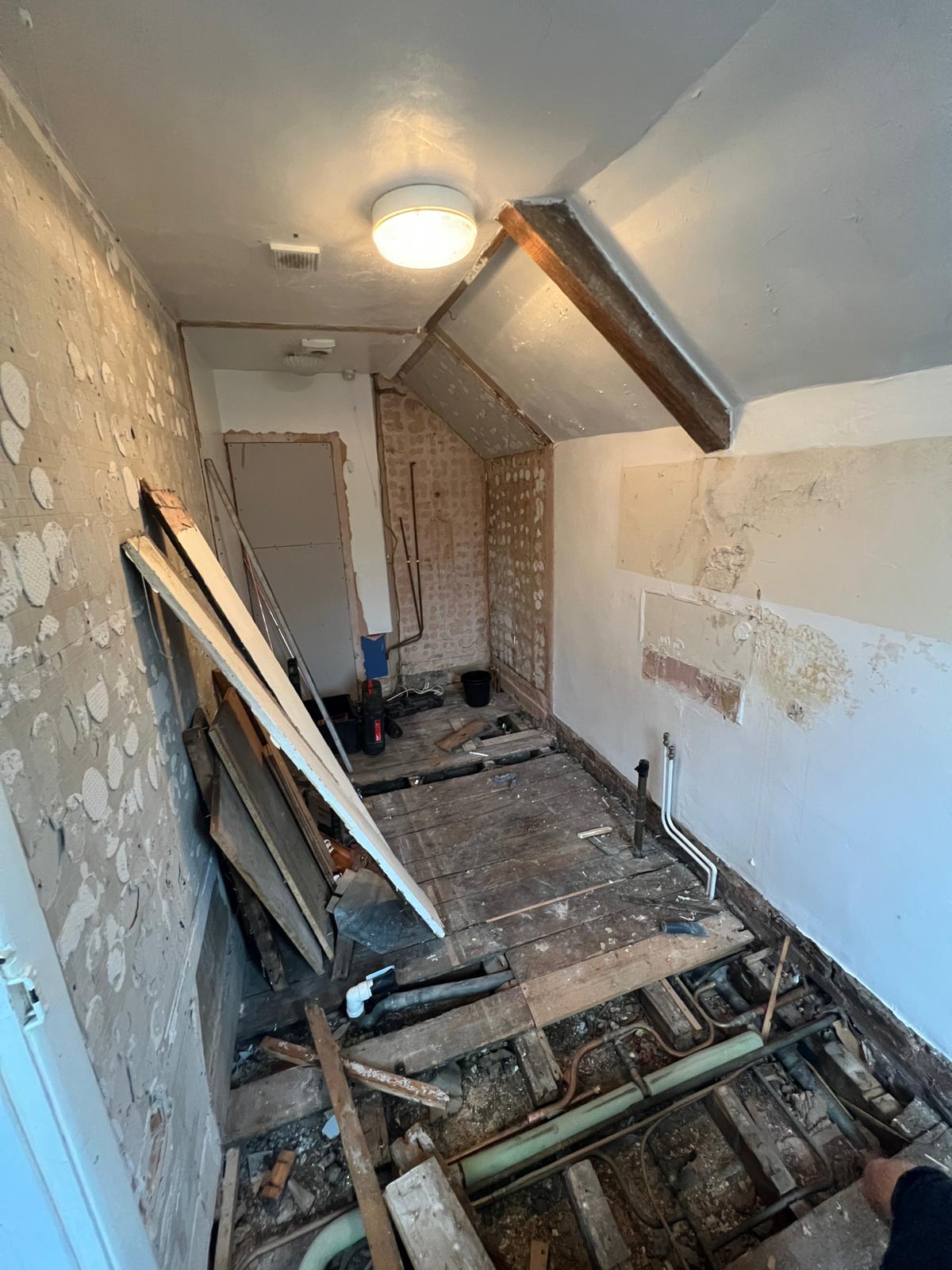 This transformation involved ripping out the existing floor, levelling the timber floor joists and laid 22mm moisture resistant flooring. Re plaster boarded and plastered throughout. Updated electrics, installed downlights, shaver points, extraction fan and electric heater. We installed a new water pump for better water pressure, a shower and enclosure, a modern bath, his and hers sinks and a toilet. All the walls are tile effect aqua panels. We fitted new skirting and architrave then finally squared up and refitted the hundred year old door.