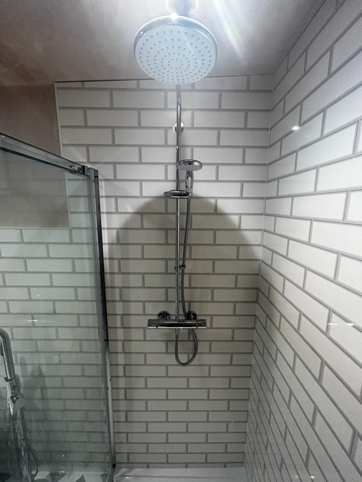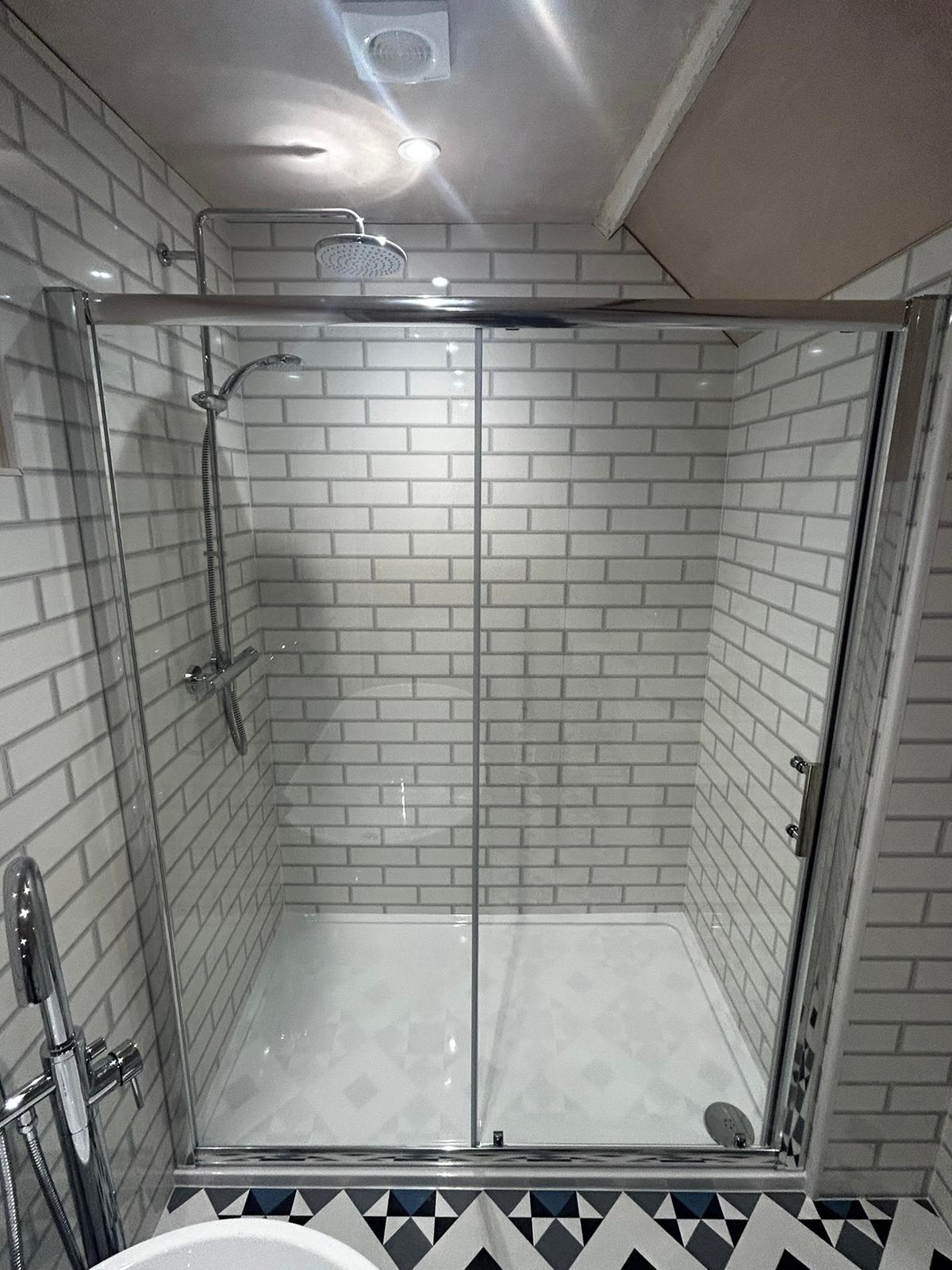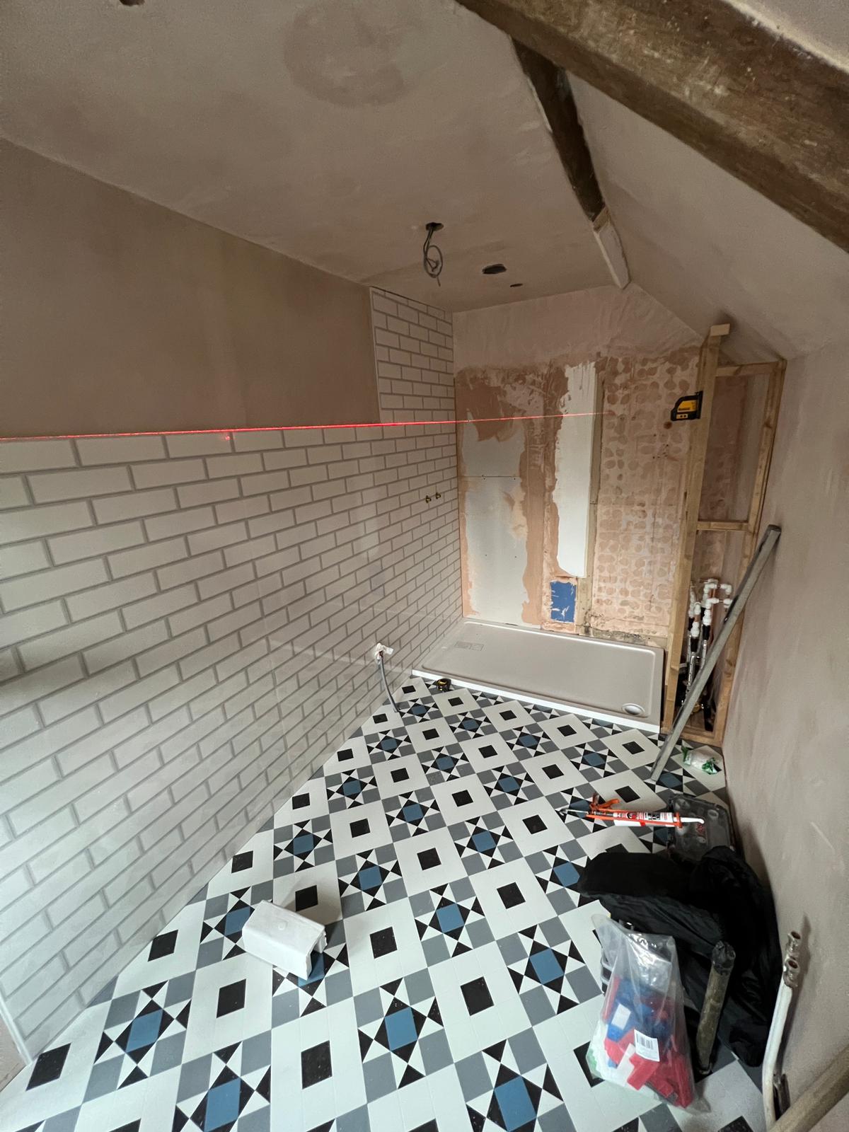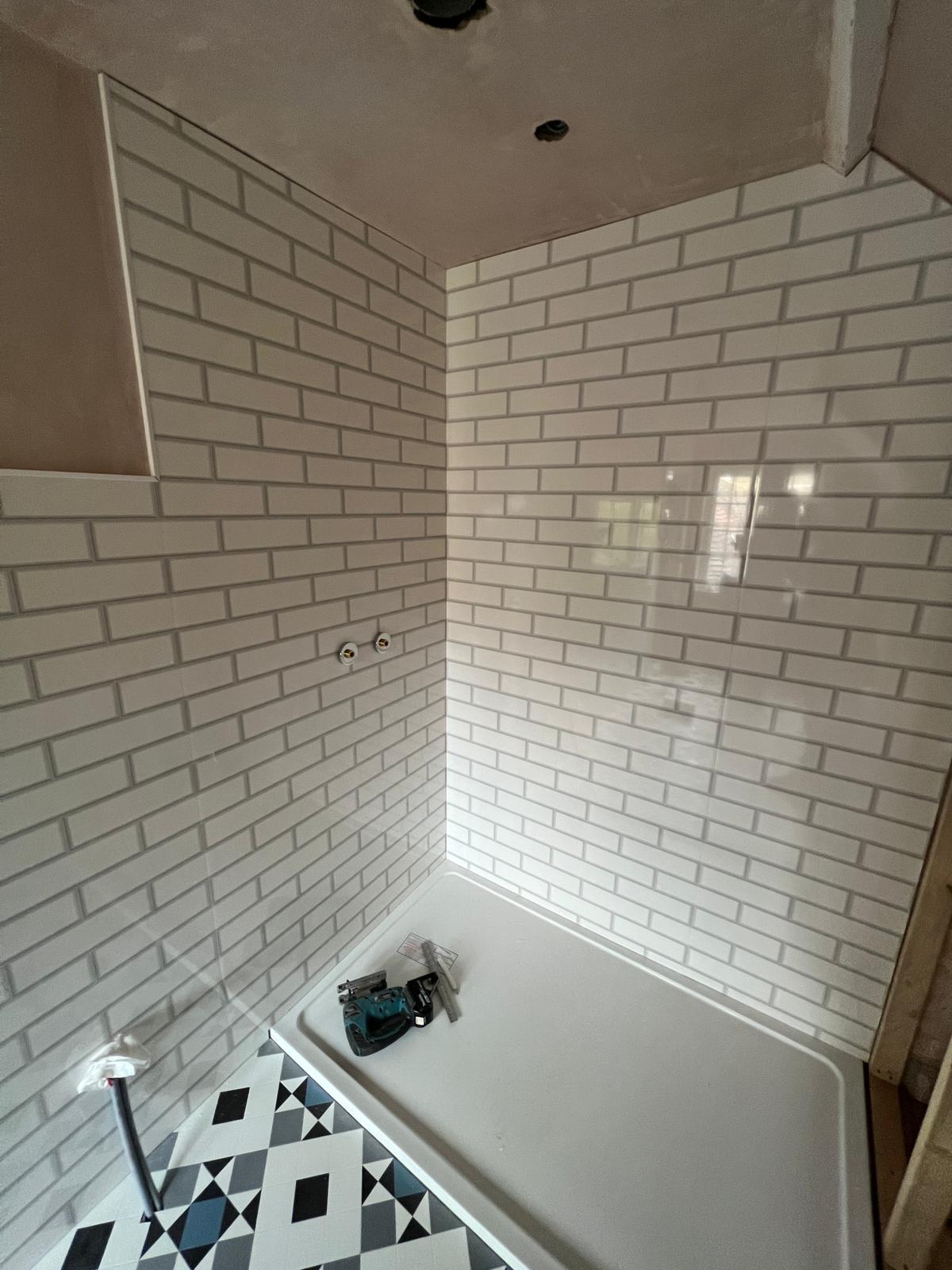 This transformation involved ripping out the existing floor, levelling the timber floor joists and laid 22mm moisture resistant flooring. Re plaster boarded and plastered throughout. Updated electrics, installed downlights, shaver points, extraction fan and electric heater. We installed a new water pump for better water pressure, a shower and enclosure, a modern bath, his and hers sinks and a toilet. All the walls are tile effect aqua panels. We fitted new skirting and architrave then finally squared up and refitted the hundred year old door.
