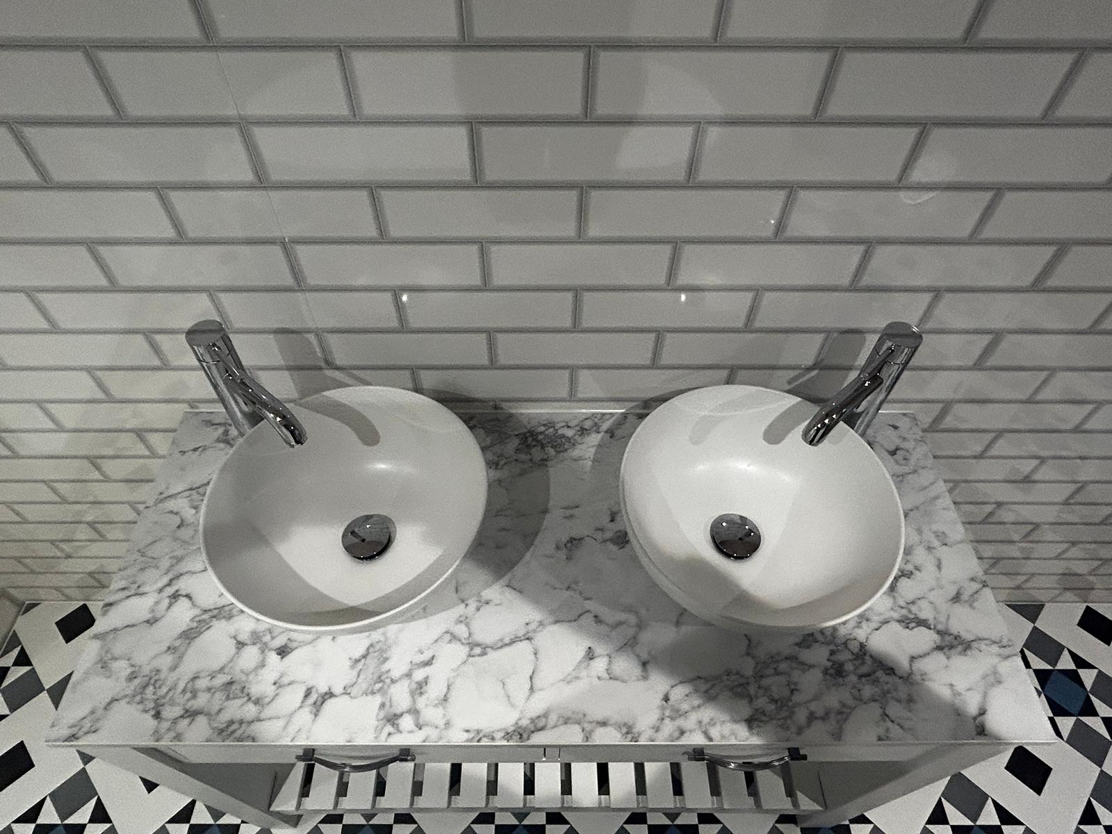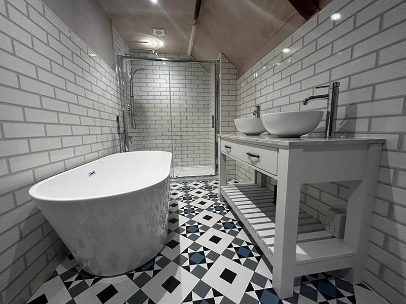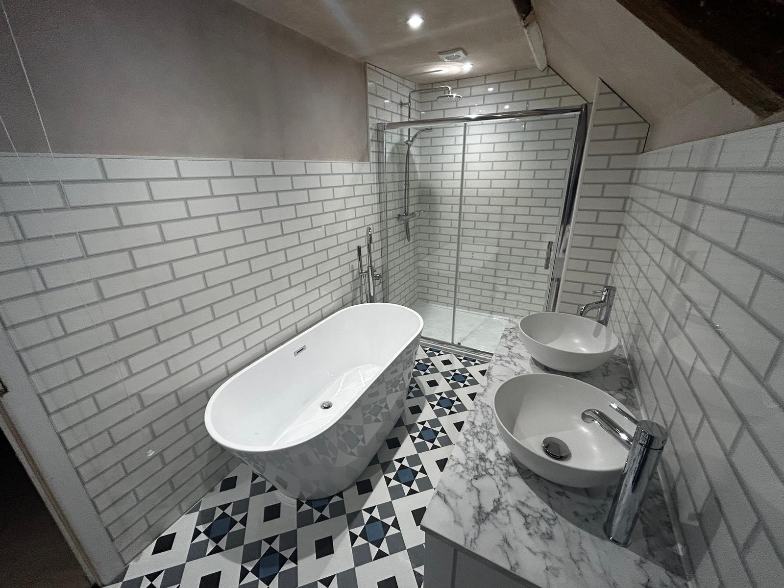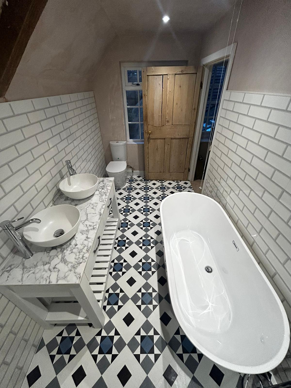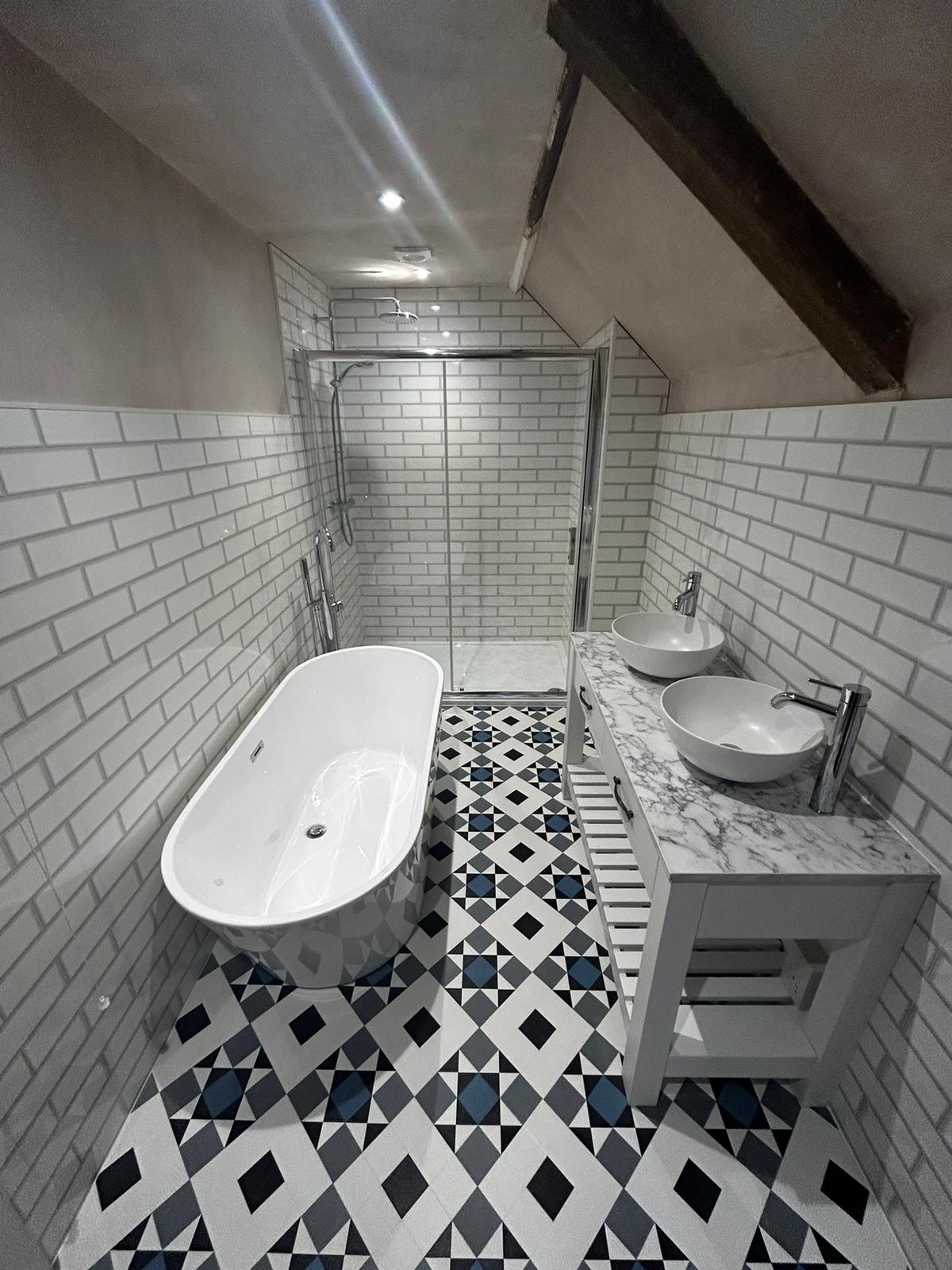 This transformation involved ripping out the existing floor, levelling the timber floor joists and laid 22mm moisture resistant flooring. Re plaster boarded and plastered throughout. Updated electrics, installed downlights, shaver points, extraction fan and electric heater. We installed a new water pump for better water pressure, a shower and enclosure, a modern bath, his and hers sinks and a toilet. All the walls are tile effect aqua panels. We fitted new skirting and architrave then finally squared up and refitted the hundred year old door.